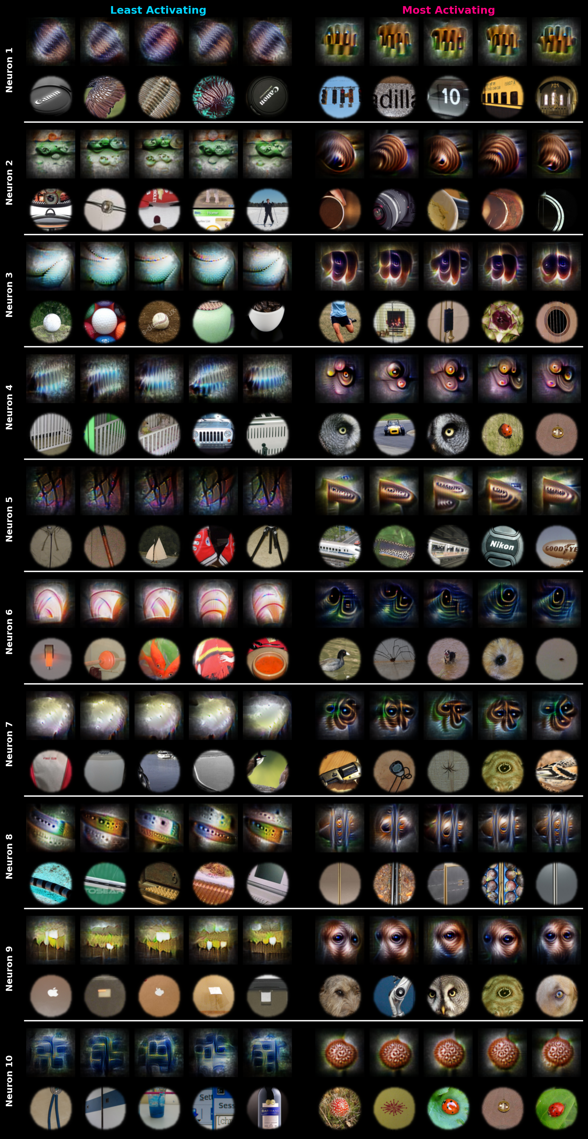Using gradient-based feature visualization, we created images that maximized or minimized predicted neuron activity, revealing structured features at both extremes. We also screened over one million ImageNet images to find natural images eliciting the strongest and weakest responses.
